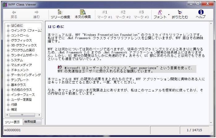 先進的なユーザーインターフェースを提供する WPF は次世代の開発ツールとして注目されていますが、従来のプログラミングスタイルとの違いがおまりに大きく、Visual Studio のヘルプでは十分とはいえません。本マニュアルは WPF を研究する過程でまとめたものです。シェアウエアではありますが、実際に使えるマニュアルとしてお使いいただけるはずです。上記のサイトからダウンロードしてください。
